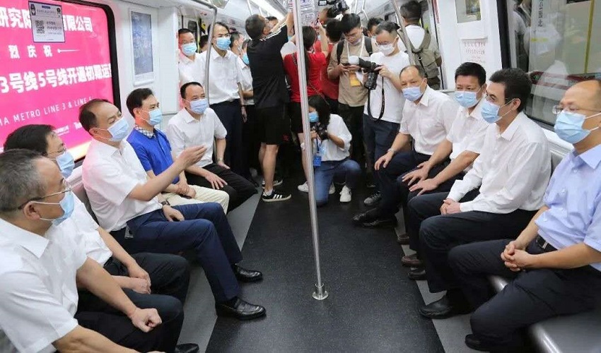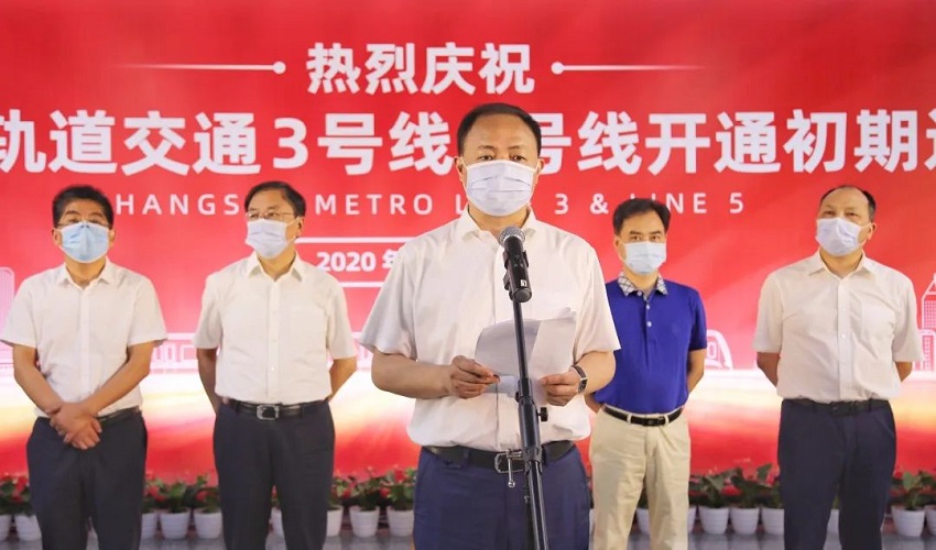 ▲長沙市委副書記、市長、湖南湘江新區(qū)黨工委書記鄭建新宣布長沙地鐵5號線正式載客初期運(yùn)營