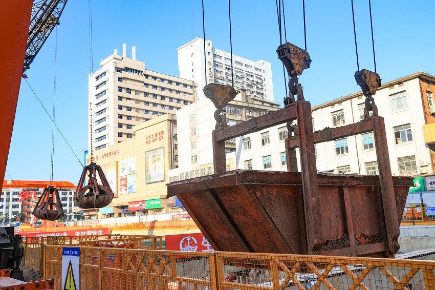 ▲丁公路北站采用龍門(mén)吊進(jìn)行基坑內(nèi)渣土出渣