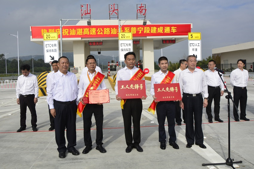 上午10:00,廣東汕湛高速公路汕頭至普寧段通車慰問活動在汕頭南收費站入口舉行,活動全面展示了中國中鐵各參建單位的建設歷程和成果,廣東省交通運輸廳、汕頭市總工會向參與項目的中國中鐵建設者致以最誠摯的慰問,并頒發了先進集體、先進個人獎牌獎章。