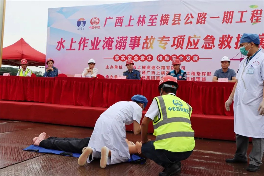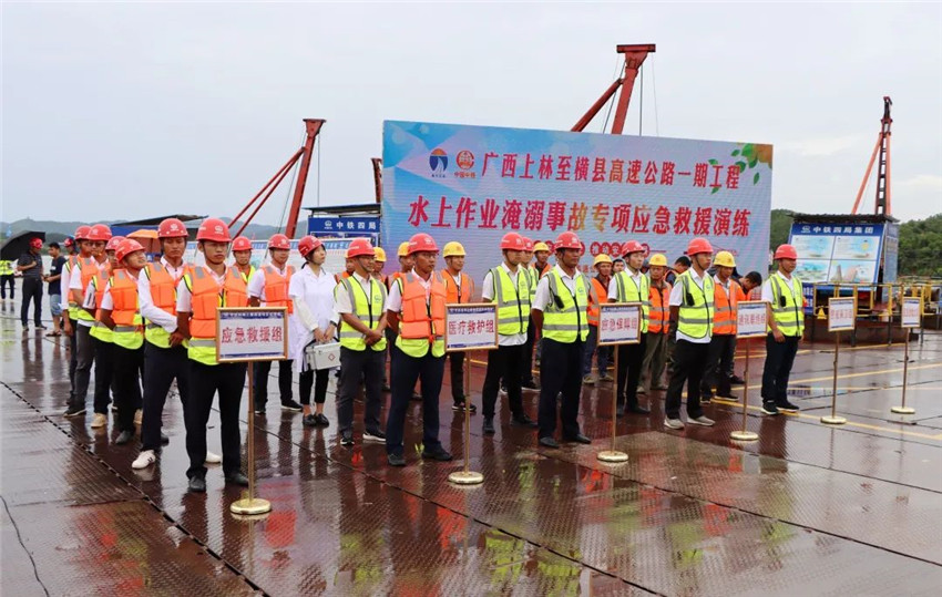 6月30日下午3時(shí),上橫項(xiàng)目組織全線各項(xiàng)目部經(jīng)理、總工、安全總監(jiān)和安質(zhì)部長在西津郁江特大橋施工現(xiàn)場開展了水上作業(yè)淹溺事故專項(xiàng)應(yīng)急救援演練。本次演練邀請(qǐng)了橫州交通運(yùn)輸局、應(yīng)急管理局給予了現(xiàn)場指導(dǎo),橫州人民醫(yī)院、應(yīng)急救援大隊(duì),橫州鎮(zhèn)派出所、南寧高速、上橫項(xiàng)目有關(guān)人員,共計(jì)90余人參加現(xiàn)場演練。