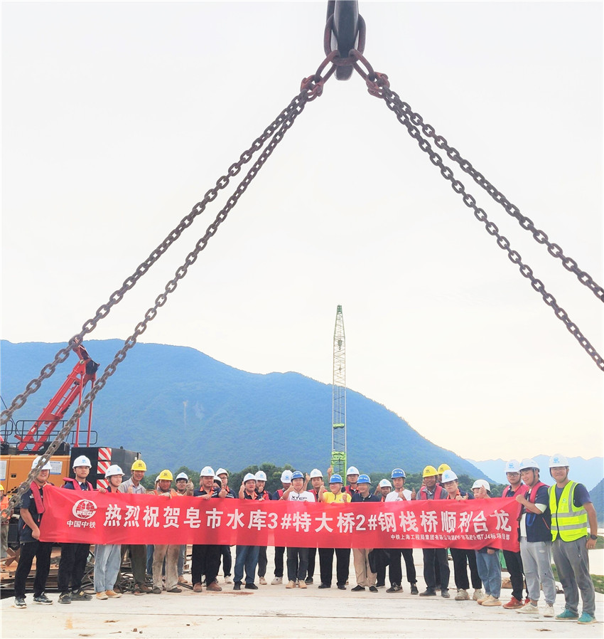 據悉,2#鋼棧橋的順利合龍,加強了皂市水庫兩岸人力、物資等建設資源的高效配置,是該段工程高質量建設的“生命線”。面對環保要求高、建設工期緊、汛期施工難度大的嚴峻形勢,全體參建人員切實提高政治站位、強化大局意識,積極克服各種不利因素影響,有效確保了施工建設按期推進:一是把安全擺在首位,優化汛期施工方案及應急預案;二是強化監督考核,注重過程控制,進行技術交底;三是優化施工組織,提升建設效率,充分展開工作面,組織鋼棧橋兩端同步施工;四是反復推敲、多管齊下,破除技術難題,針對陡坡無覆蓋層硬巖深水基礎施工環境,采用“沖擊鉆鑿平+鋼管樁插打+地質鉆錨固”的方式,實現了樁基的順利施工。