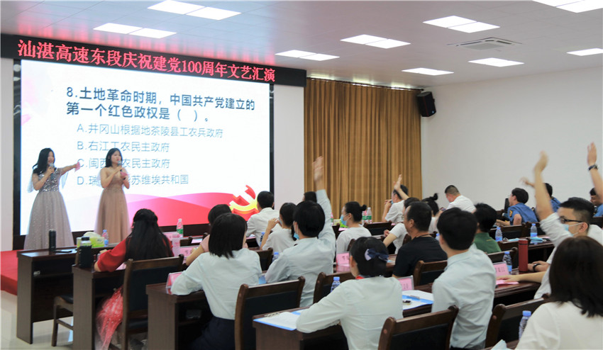 文藝匯演期間還穿插了黨史競答環節,競答內容以黨的歷史、發展為主,一波又一波的搶答將氣氛推向了高潮,贏得了現場觀眾的陣陣掌聲,切實營造出了慶祝建黨百年的濃厚氛圍。
