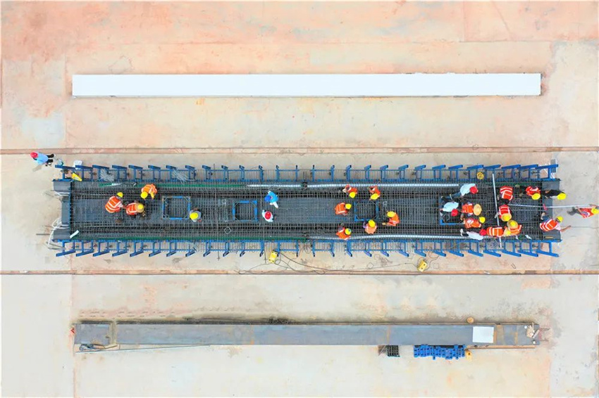 自8月中下旬預制梁場成功澆筑首片箱梁以來,項目公司、指揮部領導班子成員及相關部門負責人到現場進行督導,嚴格把控模板安裝、鋼筋綁扎、混凝土配合比、振搗等各個環節,確保箱梁生產標準化、規范化、流程化;同時,對預制梁場采用分區管理,合理布局場地,安全分區作業,設置鋼筋綁扎胎架,大大提高了鋼筋綁扎安裝效率,施工安全、質量均得到了有力保障。
